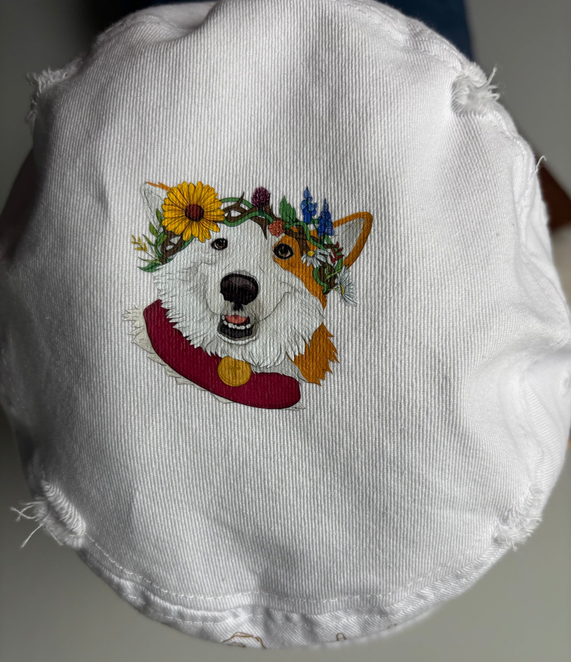 On the back, you'll find our classic "Holy Corg" logo in soft brown. And on top? A little surprise ~ my happy corgi face wearing a wildflower crown of JOY and a cross tag of faith. Because this isn't just a hat...it's a message of love.