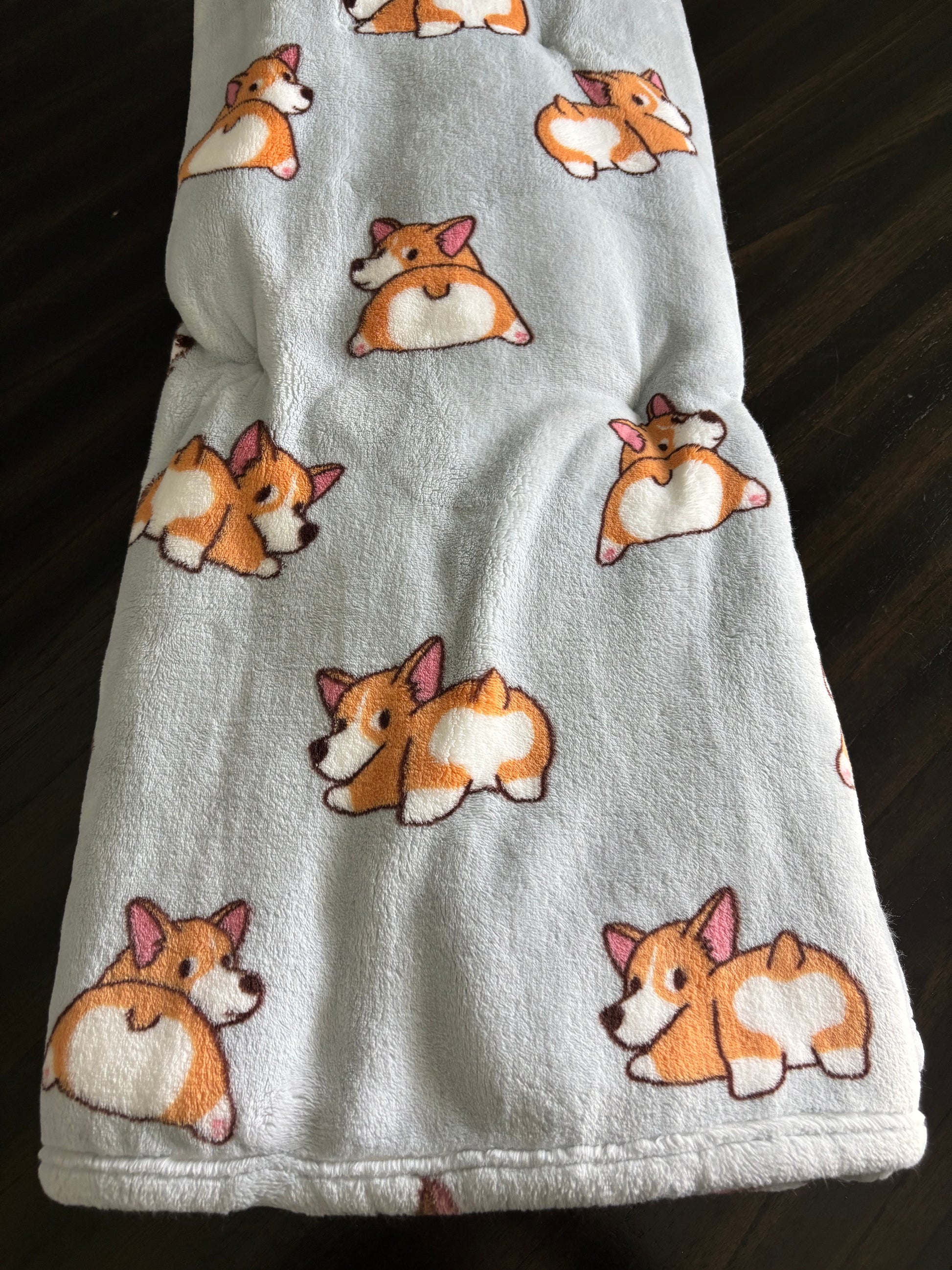 This cozy grey blanket is covered in corgis caught mid~sploot (aka: the legendary corgi flop)